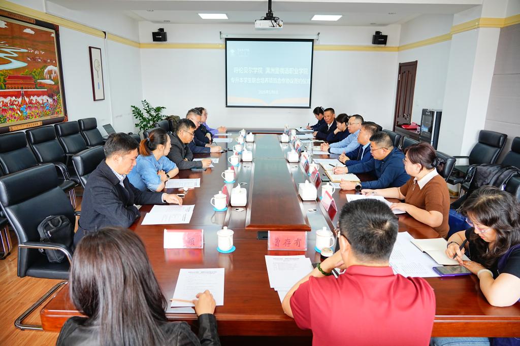 田振江對呼倫貝爾學院給予滿洲里俄語職業學院的支持致以誠摯謝意,并全面介紹了滿洲里俄語職業學院依托與內蒙古大學滿洲里學院多年“一體共建”經驗,在人才培養與技能教學方面成果豐碩。他表示此次合作,滿洲里俄語職業學院將充分發揮口岸城市特色資源優勢,為呼倫貝爾學院口岸經濟服務產業學院發展壯大添磚加瓦。希望雙方踐行職普融通、深度融合,實現師資共享、教學相長,不斷提升教師理論與實踐能力,培養更多契合本地需要的高素質應用型人才。