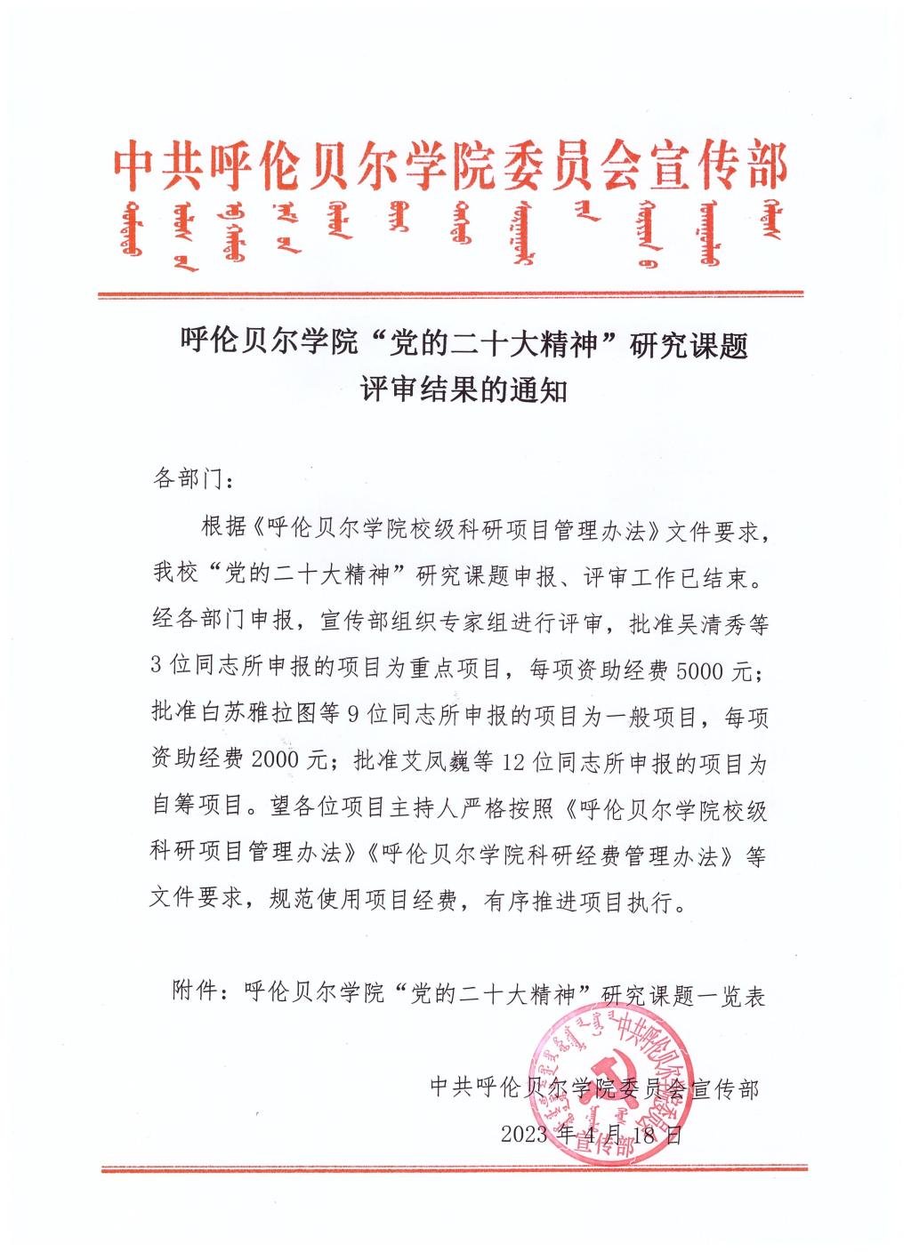 呼倫貝爾學院“黨的二十大精神”研究課題評審結果的通知